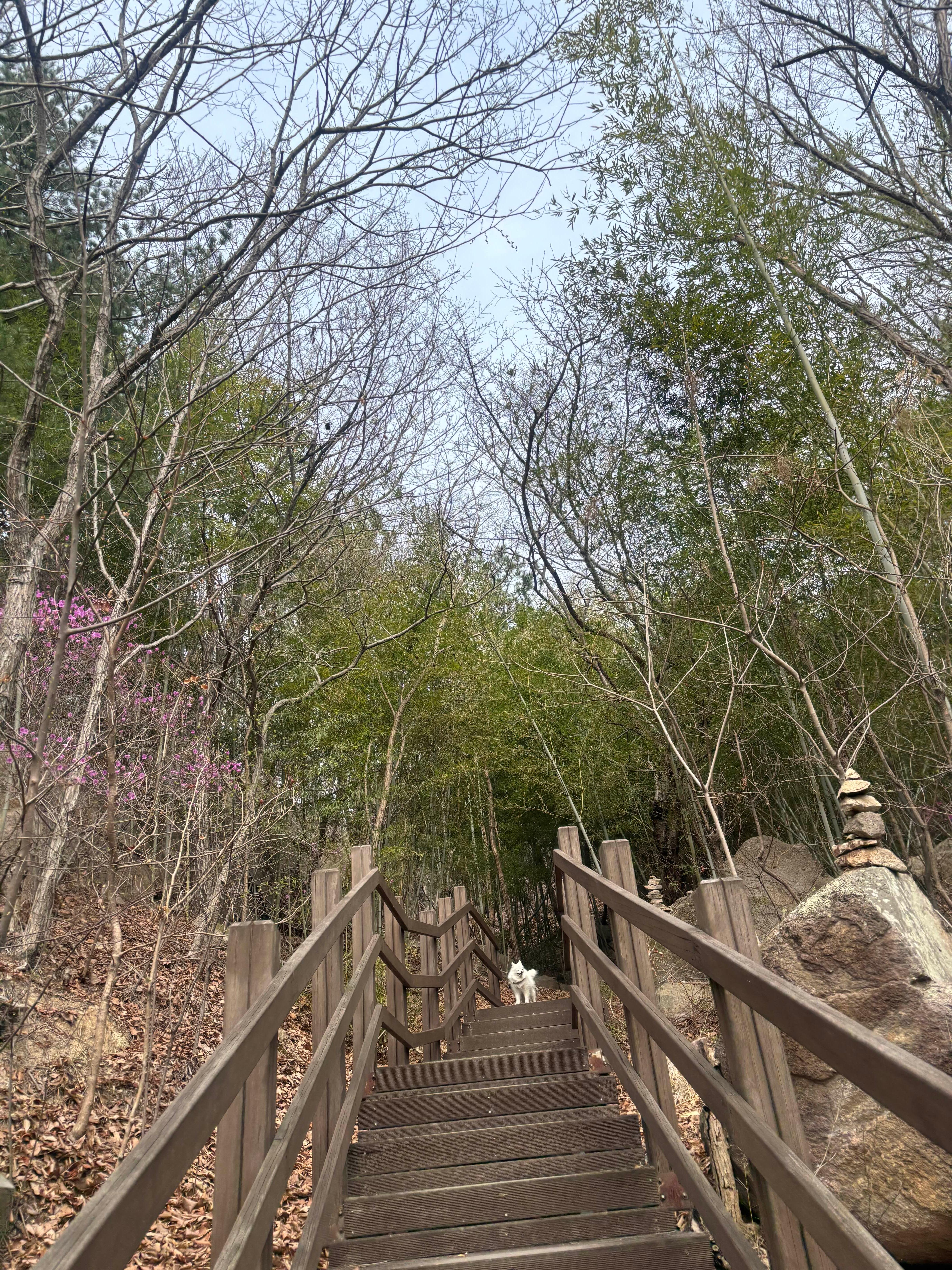 바람이 좀 불긴했지만 오르막으로 오를 예정이라 괜찮을 것 같았다. 초입부터 개나리와 진달래들이 활짝 미소지으며 나와 만두(강아지)를 반겨 주었다. 밝은 볕만큼이나 마의 기분도 밝아졌다. 만두도 신이 나서 뛰어 올랐다. 나는 감탄이 절로 나왔다. 진달래 꽃길을 걷는 동안 너무 행복했다.