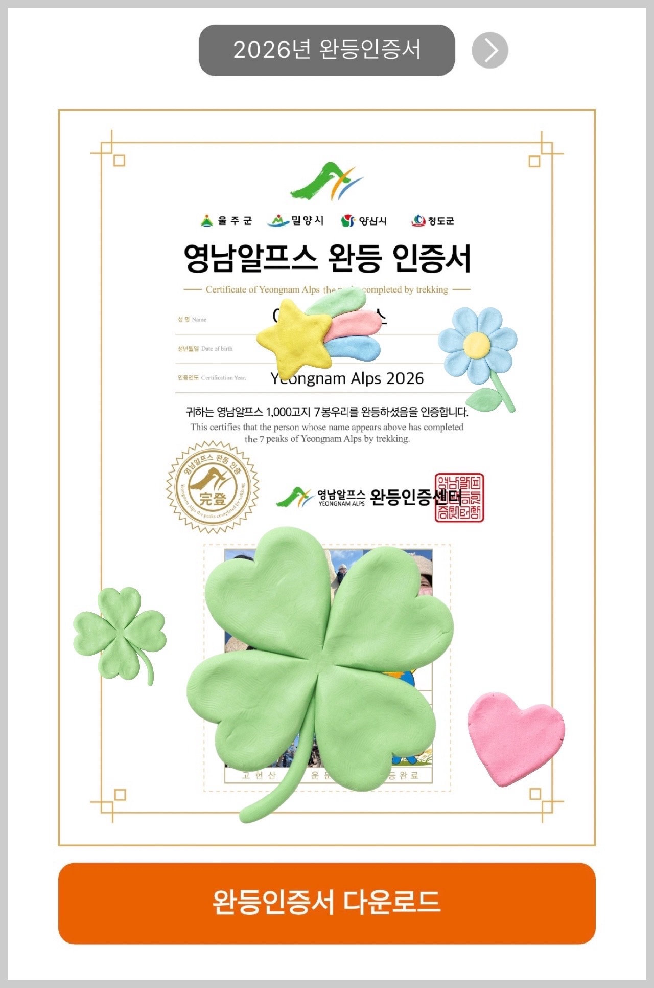 영남알프스완등인증을 완수하게 되는 날이다. (매년 새로이 시작하여 총 7개의 산을 타야 하는데, 한 달에 두 개의 산 이상 인증이 안된다.)